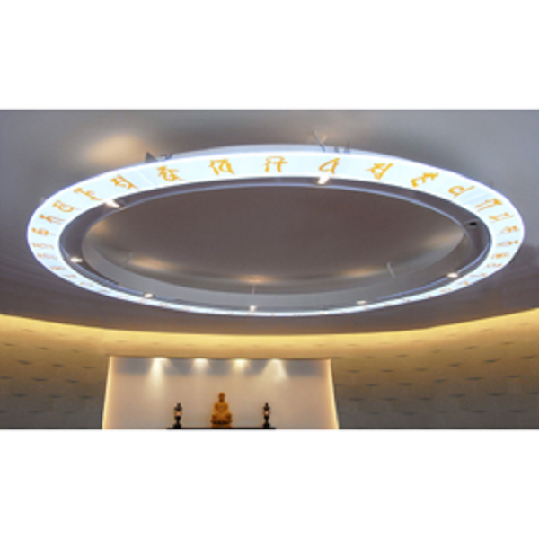 本案例運用多組獨立的超薄型背光板, 經過嚴密的機構設計與懸吊規畫, 將單獨組件運至現場組裝成型, 完成了直徑3米的大型環狀LED背光源。 完全客製化的設計充分滿足業主對情境照明的要求。